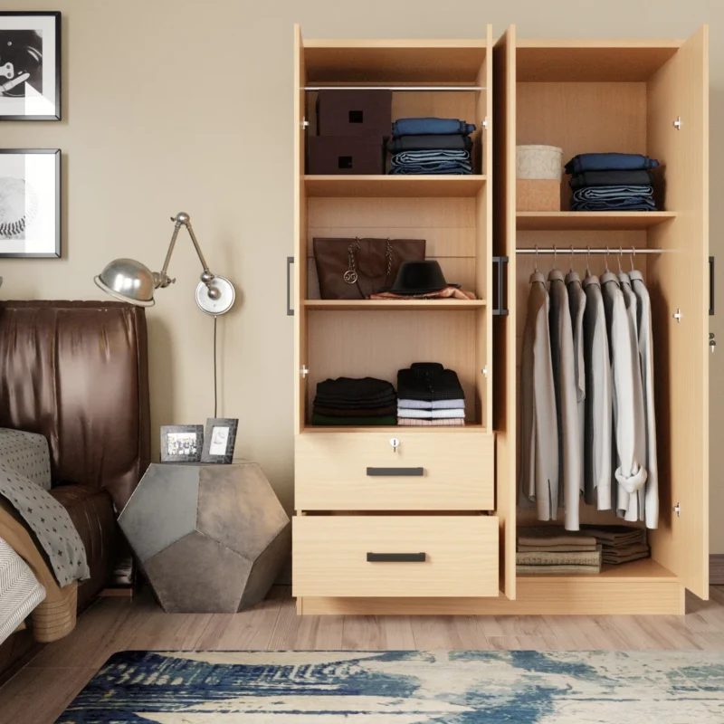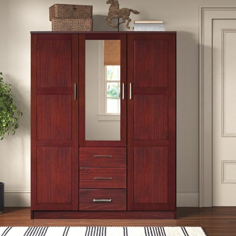 This sturdy and durable 3-door armoire from Posh House Furniture offers a spacious and organized storage solution for any room. Crafted from top-quality wood, it features six fixed shelves behind the doors, ideal for storing clothing, bedding, towels, books, and more. The included aluminum garment rod provides ample space for hanging clothes, perfect for keeping your wardrobe neat and accessible. Its modern design with 90° open doors, long wooden handles, and soft-close hinges makes it a stylish and practical addition to bedrooms, guest rooms, kids’ rooms, or dens.