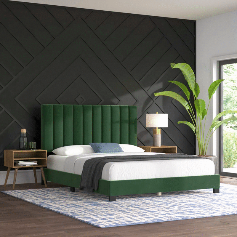 Wingback headboard with gold strip accents for a touch of sophistication