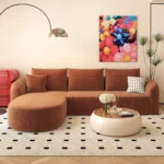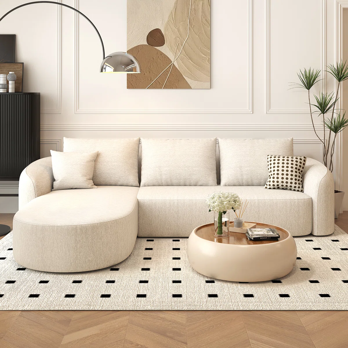 This minimalist modular sectional sofa is wrapped in luxurious chenille fabric and defined by its sleek, curved lines — creating a sculptural silhouette that feels both inviting and refined. The L-shaped chaise design offers generous space for lounging, making it perfect for relaxed family evenings or elevated entertaining.