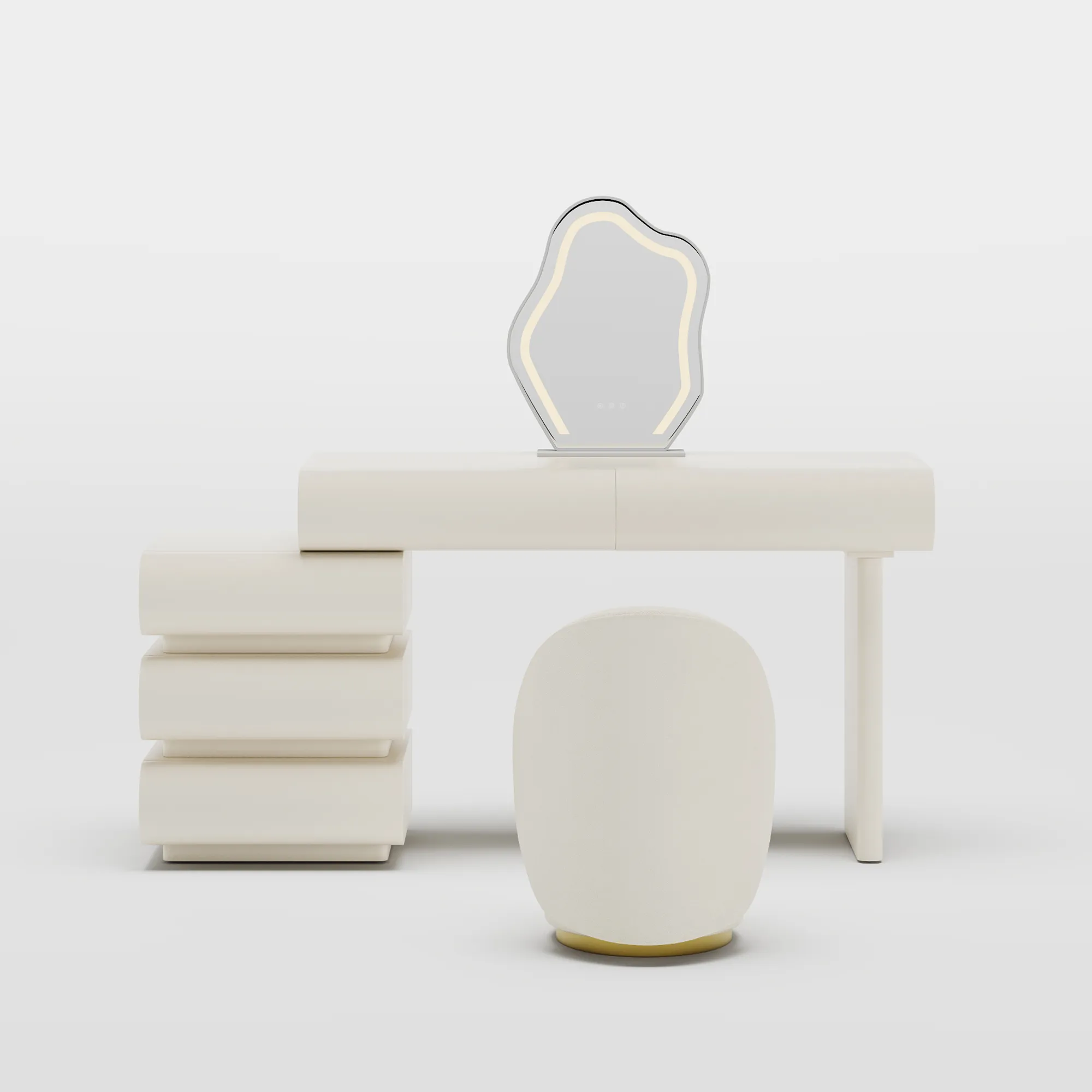 The highlight of the set is the uniquely designed cloud-shaped mirror, adding a fashionable and artistic touch that enhances the overall appeal. The included stool with backrest provides extra support and comfort, making your makeup sessions relaxed and enjoyable. Perfect for creating a chic and organized vanity space while adding a decorative element to your room.