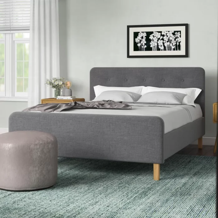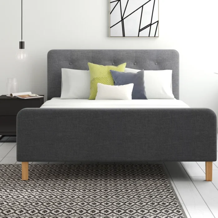 This upholstered bed features a sophisticated design with button stitching on the headboard, elegant wooden legs, and a sleek curved frame. The foam-padded headboard provides exceptional comfort, making it perfect for sitting upright while reading or relaxing. Available in a variety of sizes, this bed seamlessly fits into any interior style.