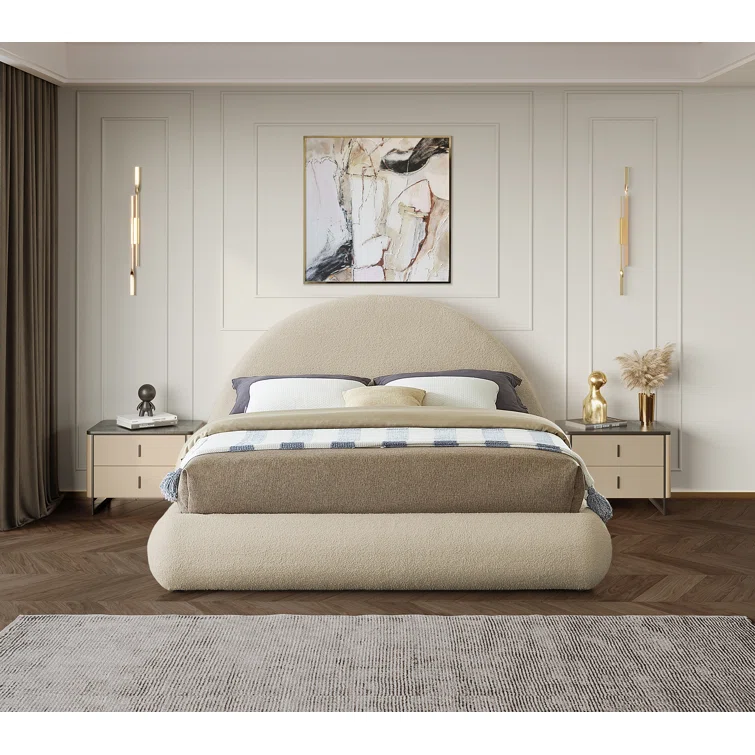 Give your bedroom a modern touch with this teddy fabric bed. The rounded headboard serves as a striking focal point, while the stacked design adds a contemporary flair to your space. Its soft, neutral color effortlessly complements your existing furniture, and the frame, crafted from high-quality materials, ensures long-lasting durability, making this bed a perfect addition to your bedroom sanctuary.