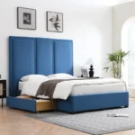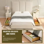Add a sophisticated touch to your bedroom with this timeless upholstered bed. Its clean, airy design and raised headboard make it a stunning focal point, enhancing the overall beauty of your space. Crafted from solid and engineered wood, the frame is filled with soft foam and wrapped in premium linen fabric, ensuring a sturdy, durable, and comfortable foundation for restful nights. Equipped with a thick center support feet, this bed offers exceptional support and works well with mattresses ranging from 25 to 30 cm in height. Plus, it features two drawers for convenient storage.