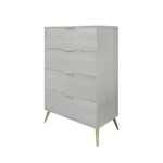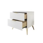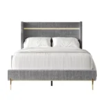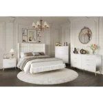edesign your bedroom into a haven of luxury and comfort with this elegant furniture set from Posh House Furniture. Thoughtfully crafted from solid and engineered wood, each piece offers lasting strength and timeless appeal. The bed, upholstered in plush white velvet with a refined wingback design and gold accents, brings a sophisticated charm to any space. Coordinated nightstand, dresser, and chest complete the look, combining practicality with modern elegance. Featuring soft corduroy texture, golden metal legs and handles, and generous storage — this set adds both function and flair to your room.
