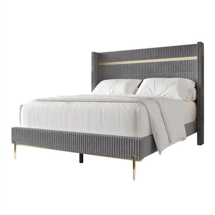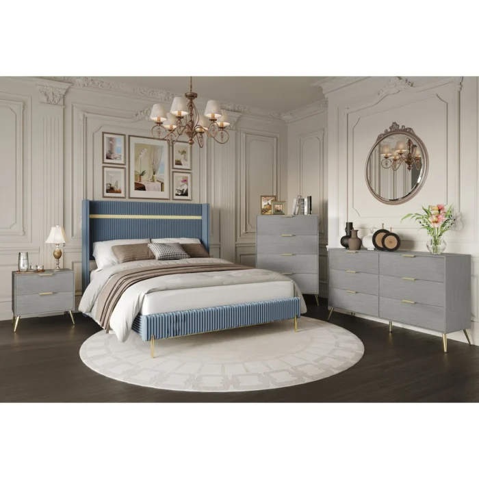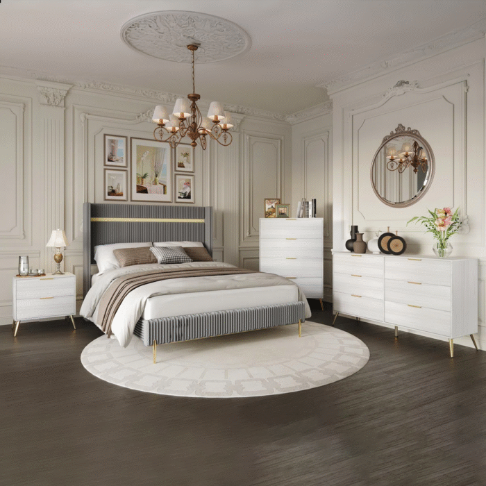edesign your bedroom into a haven of luxury and comfort with this elegant furniture set from Posh House Furniture. Thoughtfully crafted from solid and engineered wood, each piece offers lasting strength and timeless appeal. The bed, upholstered in plush white velvet with a refined wingback design and gold accents, brings a sophisticated charm to any space. Coordinated nightstand, dresser, and chest complete the look, combining practicality with modern elegance. Featuring soft corduroy texture, golden metal legs and handles, and generous storage — this set adds both function and flair to your room.